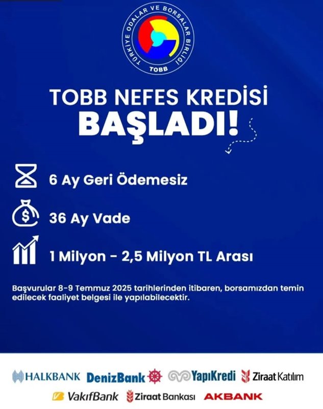 Türkiye Odalar ve Borsalar Birliğinden Odamıza iletilen 8.7.2025 tarih ve E-34221550-045.99-7698 sayılı yazıda; TOBB Nefes Kredisine ilişkin protokolün Kredi Garanti Fonu (KGF) ve Ziraat Bankası, Halkbank, Vakıfbank, Akbank, Yapı ve Kredi Bankası, Denizbank ve Ziraat Katılım Bankası ile imzalandığı belirtilmektedir.